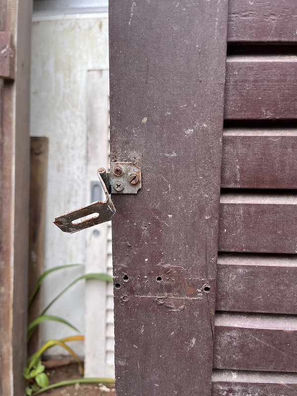 Folha de janela de madeira com veneziana cega.