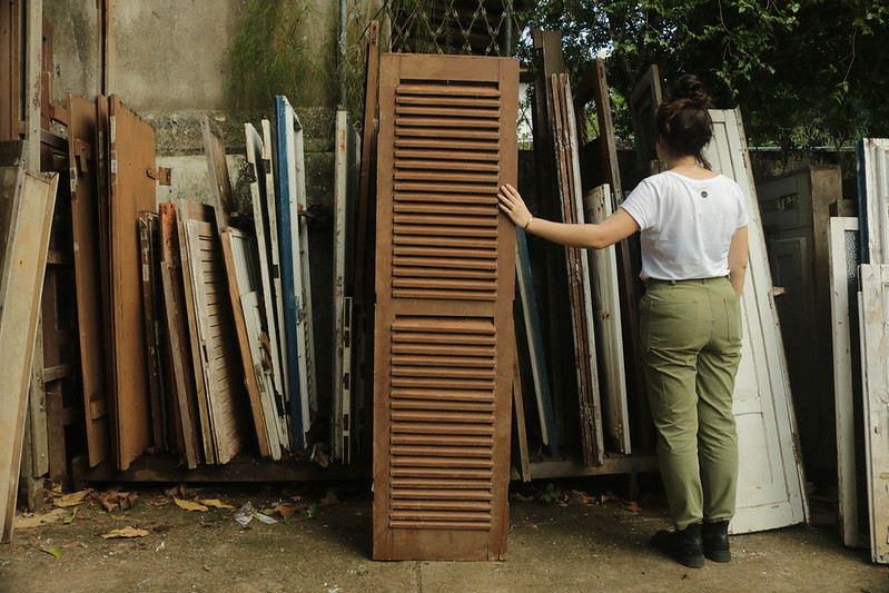 Folha de janela de madeira com veneziana e pintura marrom – 47 x 175,5 cm