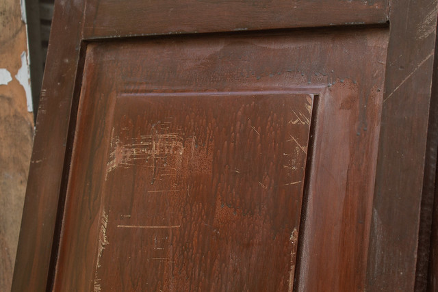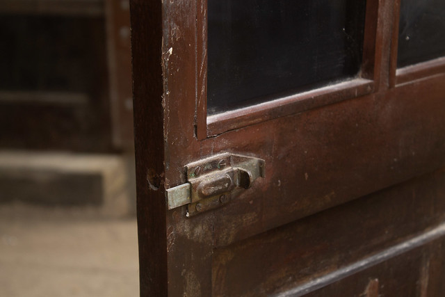 Possui dobradiças incompletas e ferrolho