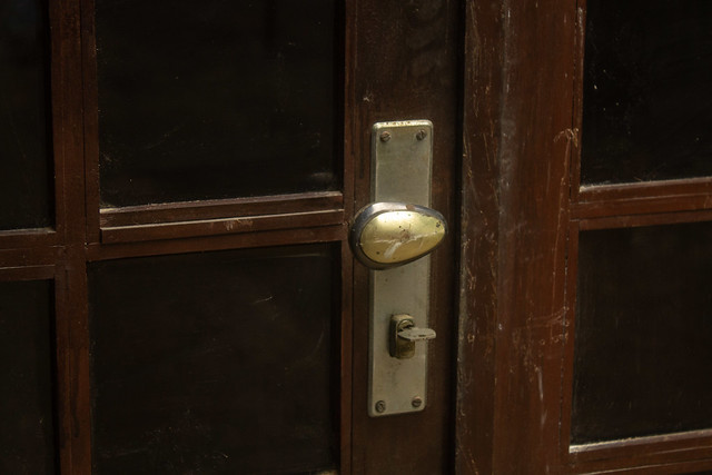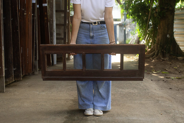 Porta francesa de madeira maciça com duas folhas e bandeira fixa, painéis de vidro com película fumê